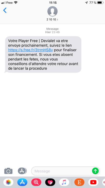 Étape 3 : sms reçu le 25/12/2018 à 23h48. Paiement 48x fait et accepté à 00h46.