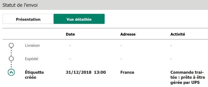 01/01/19 06:19 : Etiquette UPS créée num suivi dispo dans de suivi commande
