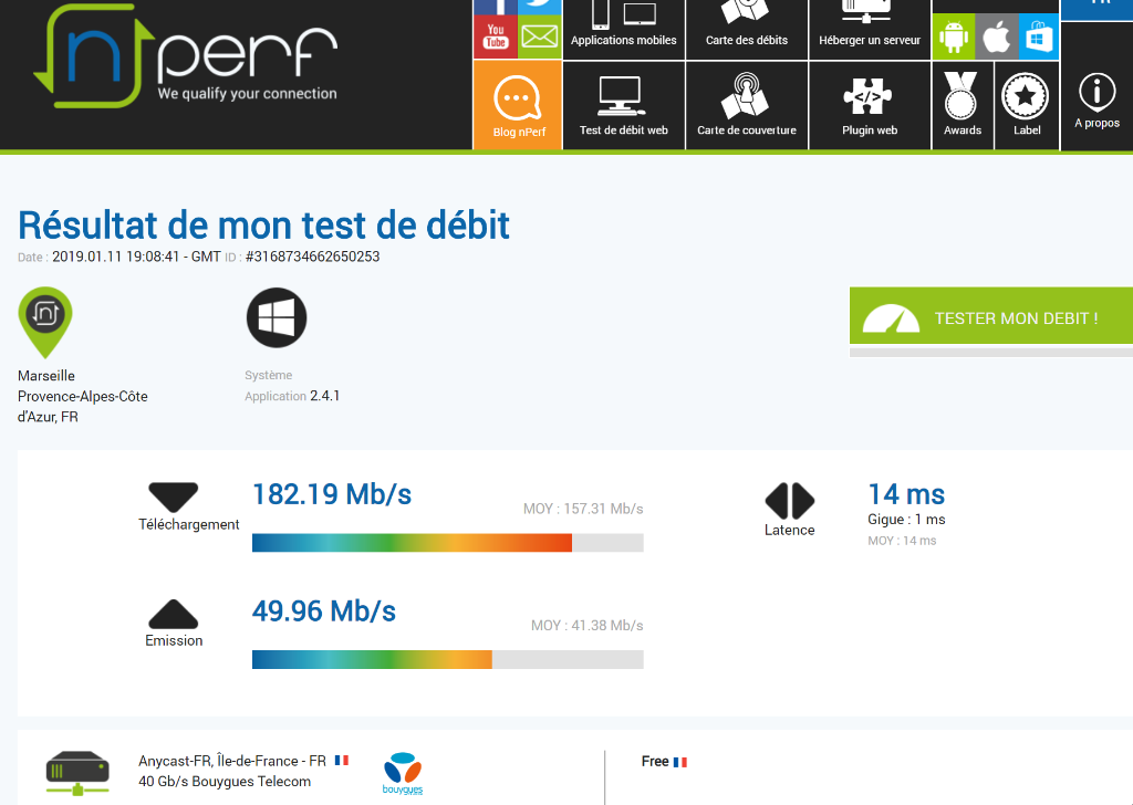 Avec un mobile je suis autour de 70 mb's au meme endroit que ma box.