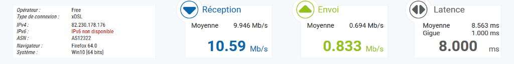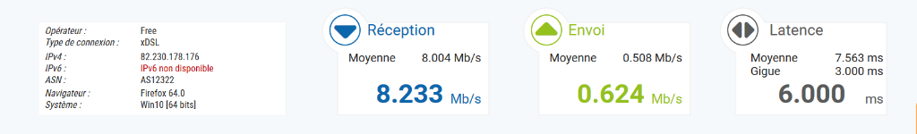 J'ai 1,4 Mega en ADSL et 6 Mega en 4G à la maison.