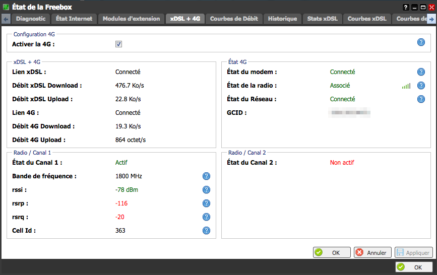 - Légère augmentation de débit sans agrégation 4G, et grosse augmentation avec (même si je m'attendais à un peu plus./ J’'étais entre 4 et 5Mb/s (4350m du DSLAM...) et avec agrégation , ça monte à 32Mb environ. Sur mon téléphone en 4G, je suis plutôt à 60/70.. à voir si c'est dû à la différence de qualité de la réception ou à un bridage. Mais bon quoiqu'il en soit, les gamins seront content, ils pourront faire quand même faire du Netflix quand je joue en ligne :p