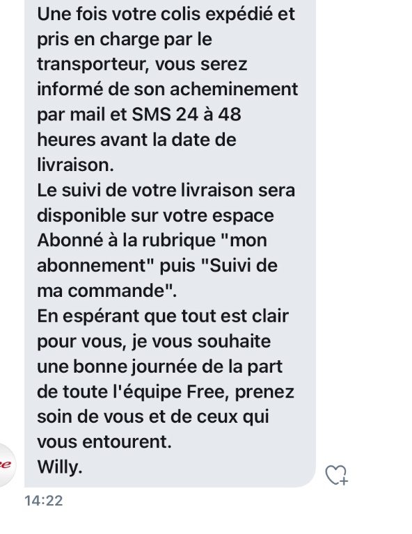 Moi je suis en fibre,, alors pourquoi je ne suis pas livré? Non pour moi c’est du grand n’ importe quoi et Free n a aucun respect de ses abonnés, ne nous tenant pas au courant.PVN85 a écrit : ↑09 novembre 2020, 16:38 Bonjour,