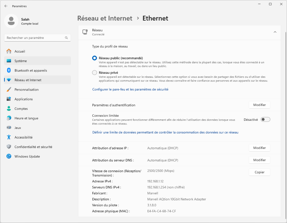 Pas de soucis Salah. Dans gestionnaires de périphériques,carte réseau ta carte réseau et propriété, avancé ,et cherche la ligne speed et duplex