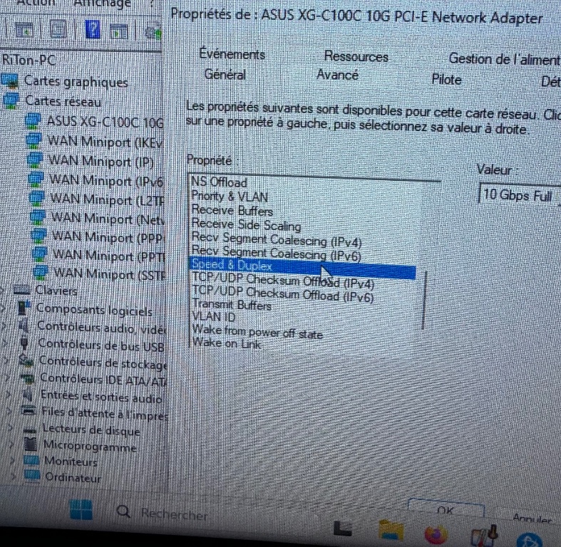 Ta refait des tests au cas ou ? Sinon la ligne speed et duplex ta bien mis 10gbts et redémarrer ton pc ?