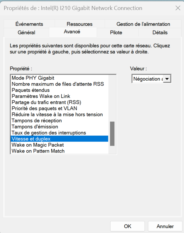 J’ai suivi à la lettre dans gestionnaires de périphériques,carte réseau ma carte réseau et propriété, avancé ,et impossible de trouver la ligne speed et duplex.