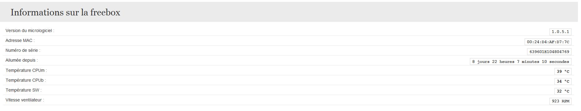 Voici les infos de ma freebox :CB2100 a écrit : Claire, cela me fait doucement "rigoler" quand on te dit que ta ligne est tout ce qu'il y a de plus "normale"!!! Quelles sont les températures du server actuellement ?