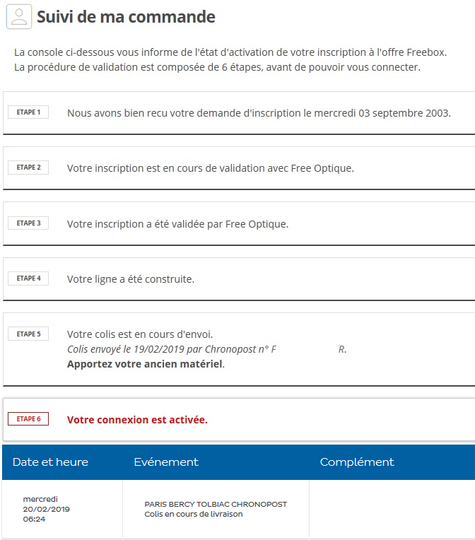Migration Delta Fibre demandée le 12/12/2018 à 11H00, livrée le 20/02/2019