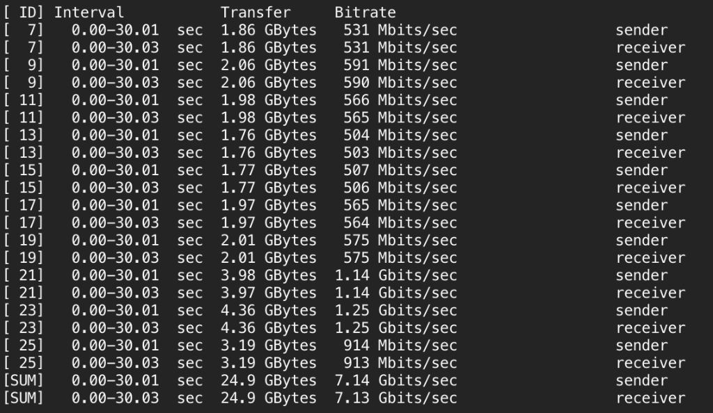 Un iperf bidirectionnel, 6.2Gbps down et 7.4Gbps up simultanément.