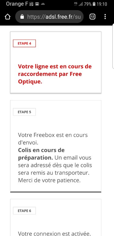 Moi aussi je viens de passer en étape 4 colis en préparation ça dépote chez Free c'est grâce à la Fibre