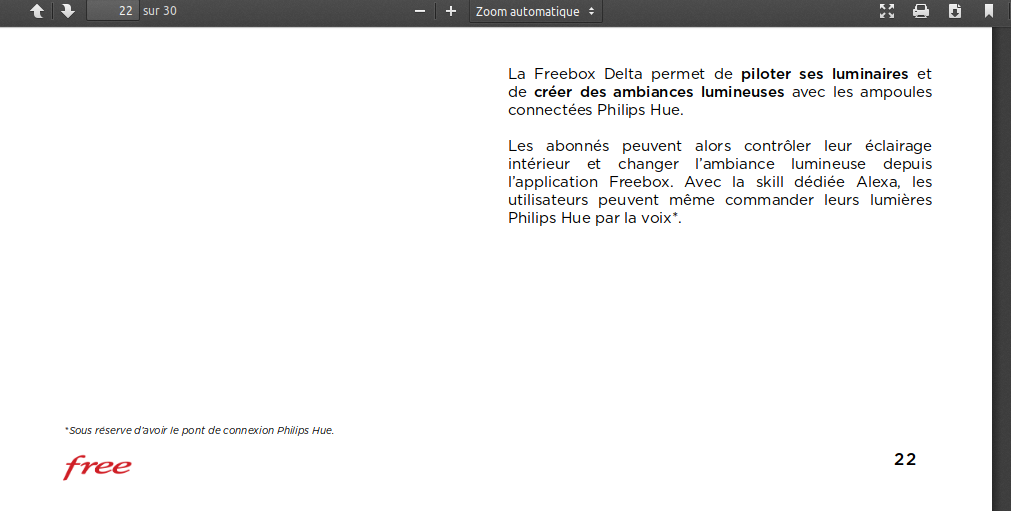 Il est d'ailleurs inscrit en petite lettres au bas de la page 22 du dossier de presse que je cite: "...les utilisateurs peuvent même commander leurs lumières ...par la voix * -> * Sous réserve d'avoir le pont de connexion Philips Hue"