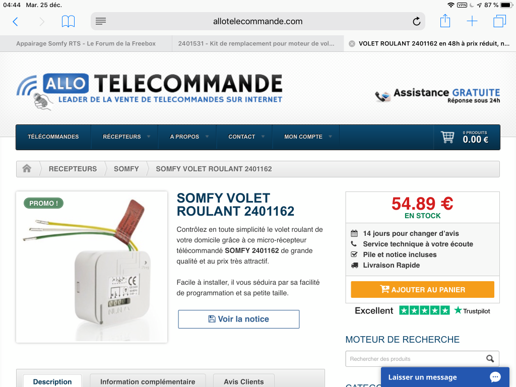 > freebox j’ai pu connecté deux de mes volets roulant Somfy avec Télécommande RTS.