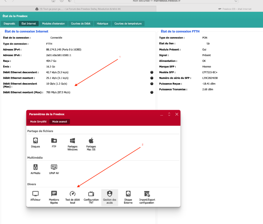 Le résultat flèche 1 donne : Débit descendant 10Gb/s (1.3 Go/s) et Débit montant 700 Mb/s (87.5 Mo/s)